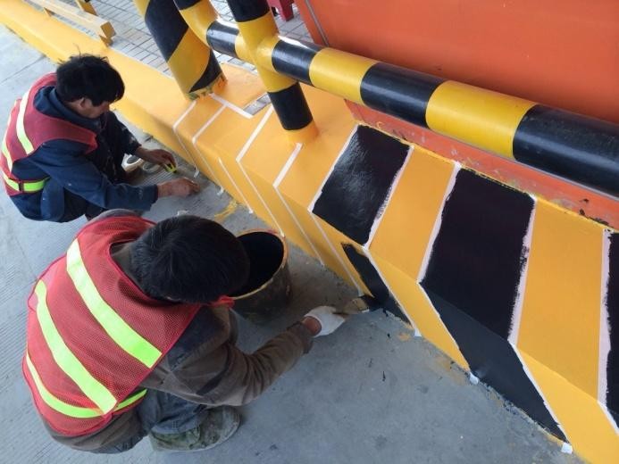 第九道工序:在涂刷好的黃黑標(biāo)線涂料上涂刷高光罩面層。